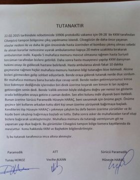 Ancak Cilvegözü’nden çıkış esnasında yaşanan diğer olaylarda yaralılar üzerinde el bombaları ve mühimmatlar çıkması nedeni ile görevli paramedik sürücü, yardımcısı ve 112 ATT tarafından hastanın bilgi tutanağının olmadığı görülerek yaralıyı kendilerine teslim eden görevlilerden hasta bilgi tutanağını istemişlerdir. Hastayı teslim eden muhafaza memurları ise sağlık çalışanlarına yönelik şiddet uygulayarak bu tutanağı vermeyeceklerini, istedikleri yerlere kendilerini şikayet edebileceklerini ve ne isterlerse de yapabileceklerini belirterek cevap vermişlerdir. Yaşadığımız bu ortamda görevlilere şiddet uygulayanlar hakkında sürücü paramedik, yardımcısı ve bir ATT görevlisi ekte görülen tutanakla ilgili kişiler hakkında şikayetçi olmuşlardır. Anlaşılan odur ki; tüm bu yaşananlardan hiçbir yetkili ders çıkarmamıştır.”