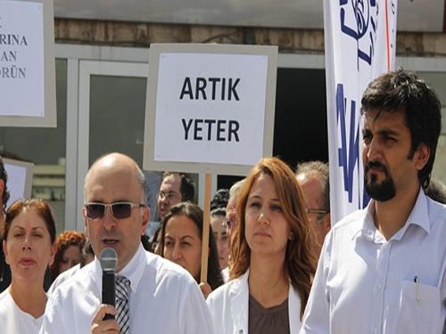 Başkent'te bir araya gelen sağlık çalışanları, 17 Nisan 2012'de hasta yakını tarafından öldürülen Dr. Ersin Arslan'ın ölüm yıldönümünde, sağlıkta şiddete dikkat çekmek için Sağlık Bakanlığı'na siyah çelenk bıraktı.