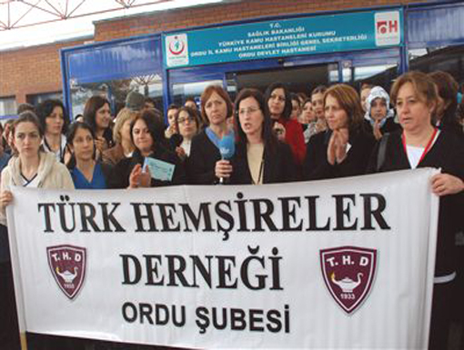 Ordu Devlet Hastanesi'nde görev yapan bir hemşirenin ve eşinin hasta yakını tarafından darp edilmesini Türkiye Hemşireler Derneği Ordu Şubesi üyeleri alkışlarla protesto etti.